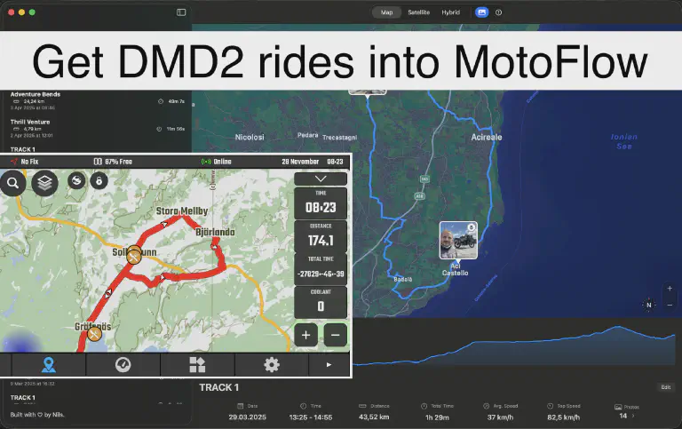 Or skip the DMD2 export workflow entirely: MotoFlow’s iPhone and Apple Watch apps can record rides directly. If you don’t need DMD2’s navigation features, just record with MotoFlow and your rides sync to your Mac automatically. No export, no import, no manual steps.