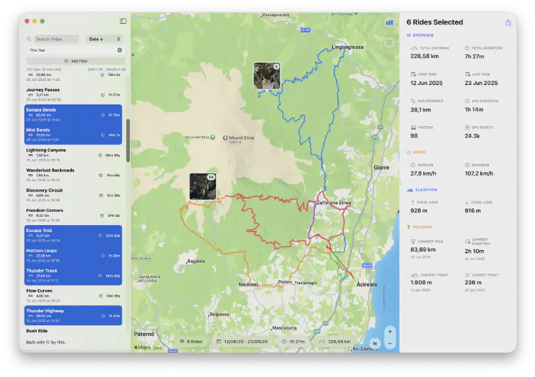 Browse by season, location, or date range. Want to see all your rides from last summer? Filter by date. Looking for that route through the Alps? Scroll to find it. No more guessing which filename was which ride.